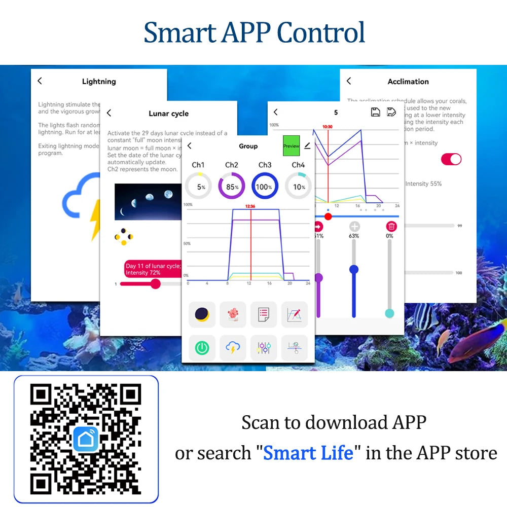 Four independent channels with 1% dimmable precision let you tailor spectral output and daily lighting schedules to mimic natural ocean conditions, promoting colorful growth and thriving corals.